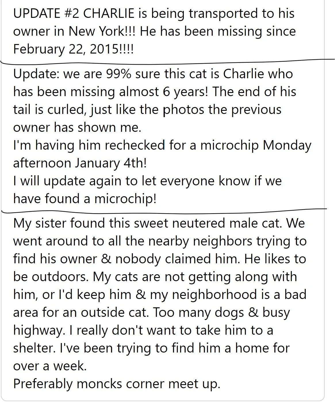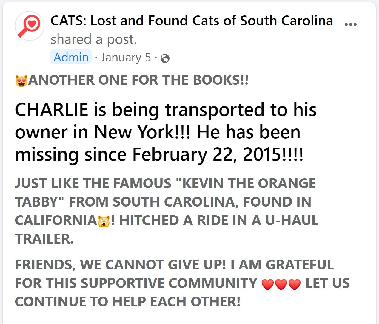 WE JUST RE-UNITED A WOMAN AND HER CAT AFTER FIVE YEARS APART! SHE HAD MOVED TO NYC BUT HAD NEVER GIVEN UP HOPE (PROOF IN HER FACEBOOK)! Five YEARS LATER, HER ORANGE TABBY IN SOUTH CAROLINA WAS BEING SENT TO HER! IT WAS A NEWS STORY YOU CAN LOOK IT UP! THE CAT’S NAME WAS CHARLIE.