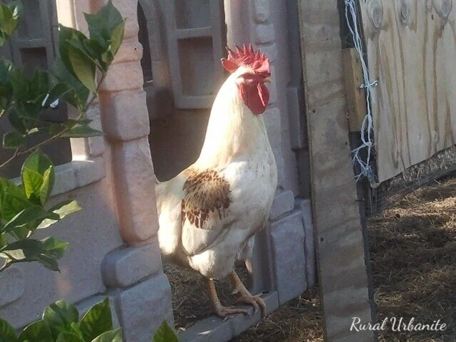 our neighbor’s wild caught gamecock sitting in his two story coop. first floor was open air space with a sand floor. Good Setup!